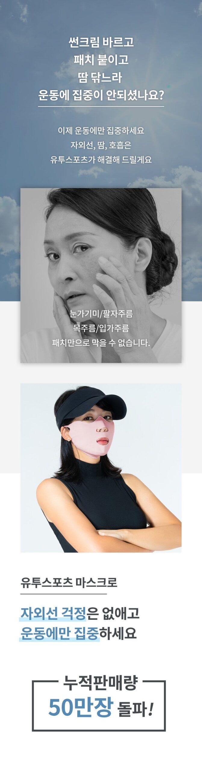 The U2 Sports Mask is your ultimate ally against the sun’s harmful UV rays, excessive sweat, and the discomfort of traditional masks during intense workouts. This revolutionary mask, a patented invention and the first of its kind in Korea, is specifically designed to tackle the challenges athletes face, from eye spots and smile lines to neck and mouth wrinkles caused by sun exposure and sweat.
