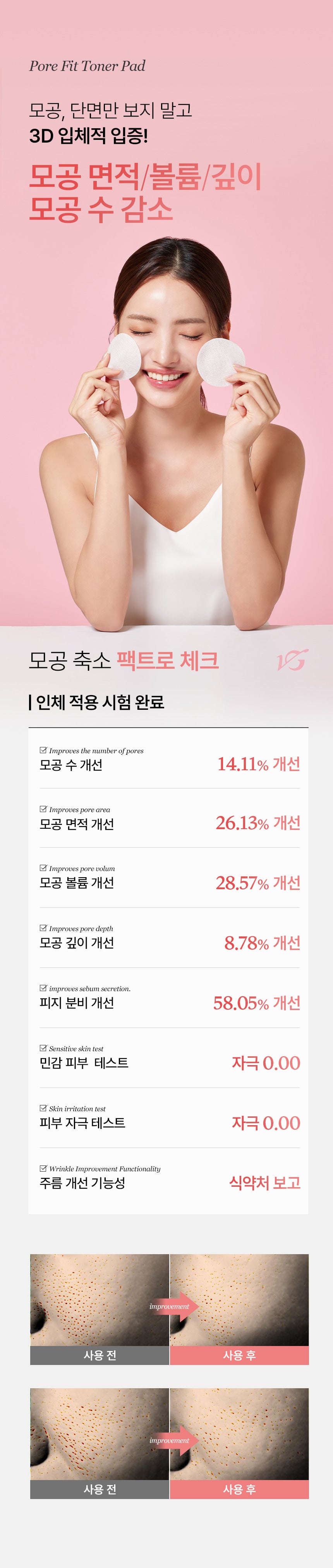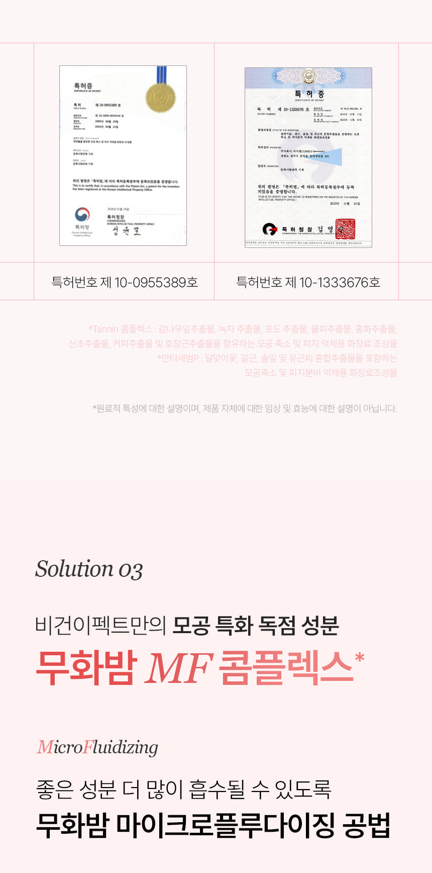 - Tannin Complex & Anti Sebum P: Work together to reduce pores and control oil balance. The tannin complex specifically targets pore size and sebum control (Patent No. 10-0955389), while Anti Sebum P firms pores and balances oil (Patent No. 10-1333676).