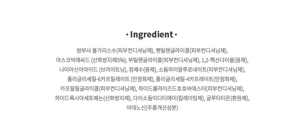 Bambusa Vulgaris Water (Skin conditioning agents, 76.23%), Pentylene Glycol (Skin conditioning agents), Ascorbic Acid (antioxidant, 5%), Butylene Glycol (Skin conditioning agents), 1,2-Hexanediol (solvents), Niacinamide (brightening), Water (solvents), Sodium Hyaluronate (Skin conditioning agents), Polyglyceryl-6 Caprylate (stabilizers), Polyglyceryl-4 Caprate (stabilizers), Caprylyl Glycol (Skin conditioning agents), Hydrolyzed Jojoba Esters (Skin conditioning agents), Hydroxyacetophenone (antioxidant), Disodium EDTA (chelating agents), Glutathione (reducing agent), Adenosine (anti-wrinkle agents).