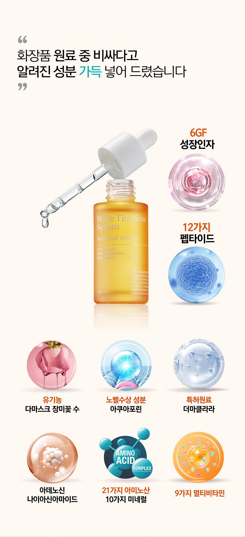 RAVE HEAL Bride Timeless Serum delivers its ingredients deep into the skin using nanoliposome technology, ensuring a penetration rate up to 83 times greater than regular growth factors. This results in faster, more visible improvements in skin texture, elasticity, and radiance.