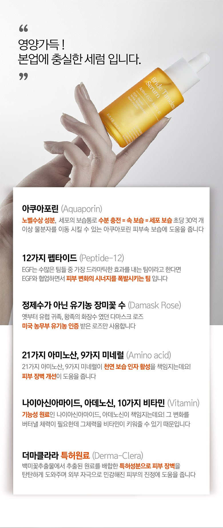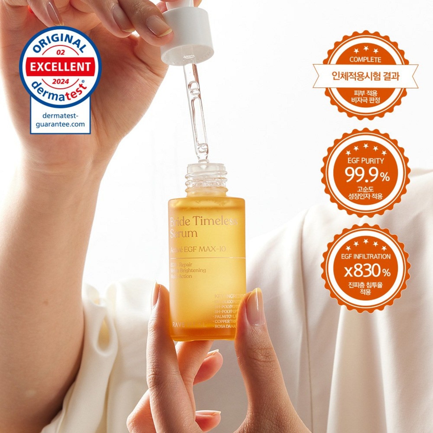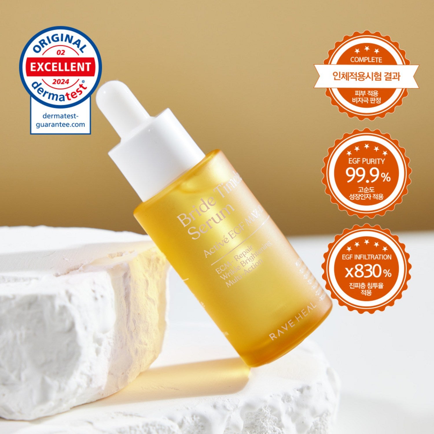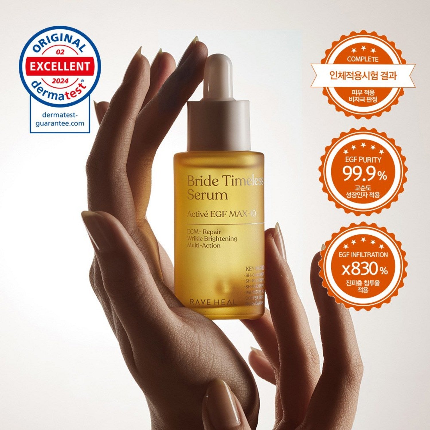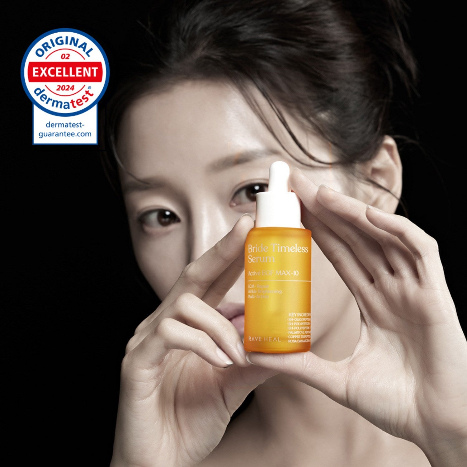 The RAVE HEAL Bride Timeless Serum is a high-performance product crafted to rejuvenate your skin to its optimal state. Infused with premium active EGF (Epidermal Growth Factor) at the highest permissible concentration, this serum works to enhance skin elasticity and diminish spots and blemishes, making it a must-have for achieving a youthful, radiant complexion.