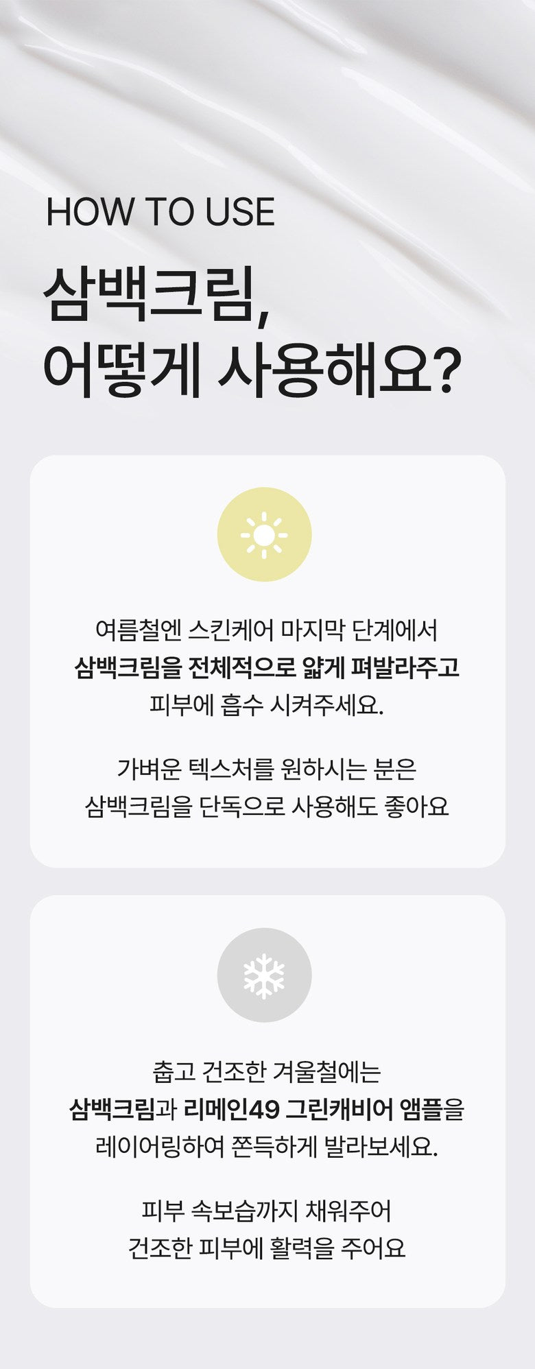 During cold and dry seasons, layer the 300 Repair Cream with the REMAIN49 Green Caviar Ampoule for a richer application. This combination provides deep hydration and revitalizes dry skin.