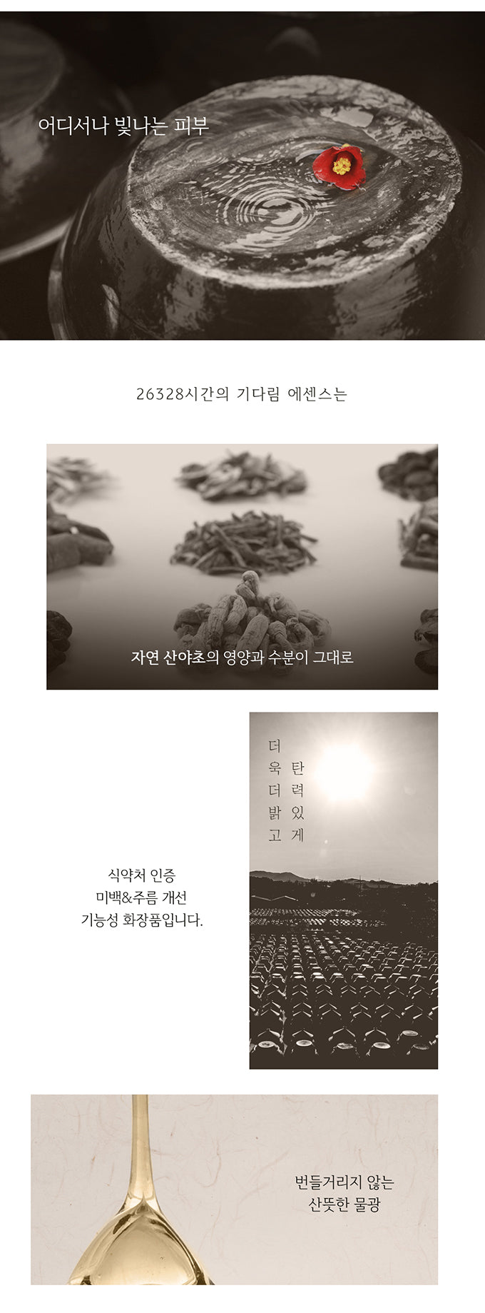 Our essence, perfected over 26,328 hours, is rich in nutrients and moisture derived from natural wild herbs. It’s a whitening and wrinkle-improving cosmetic, certified by the Ministry of Food and Drug Safety, offering a refreshing and non-greasy shine.