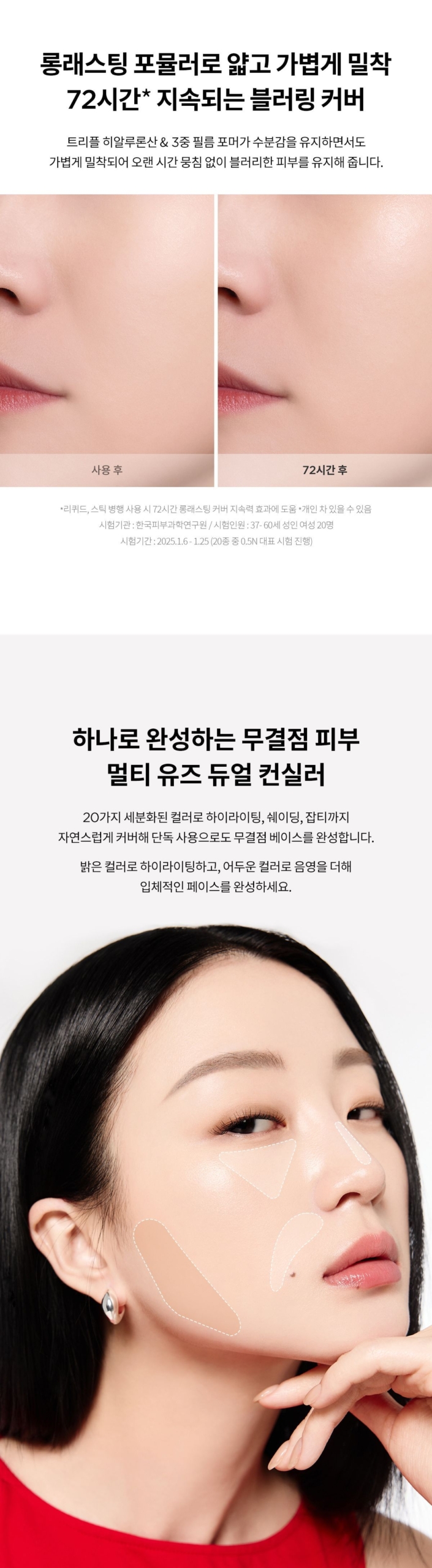 Choose your preferred format based on coverage needs. Dot concealer under eyes, on blemishes, or areas needing coverage. Blend with fingertip or sponge for seamless finish.