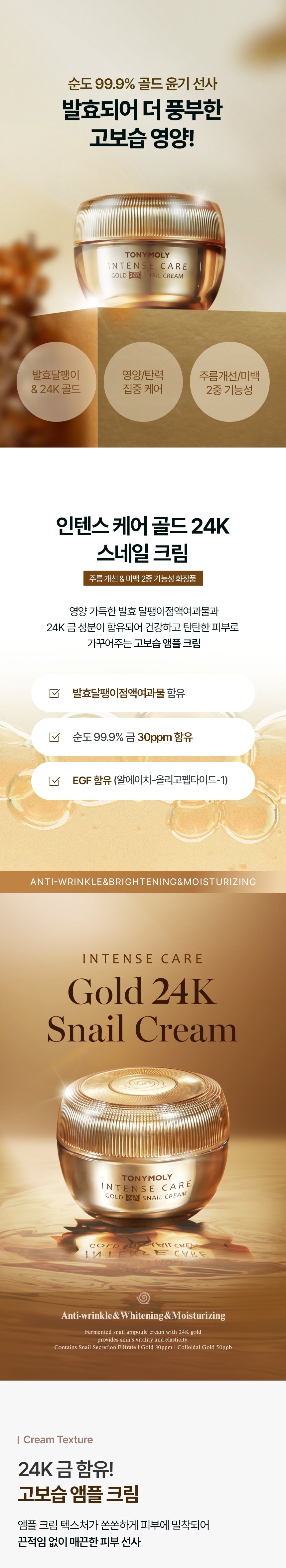 - Infused with 24K Gold & Fermented Snail: A rich blend that provides your skin with intensive nutrition and elasticity care.
