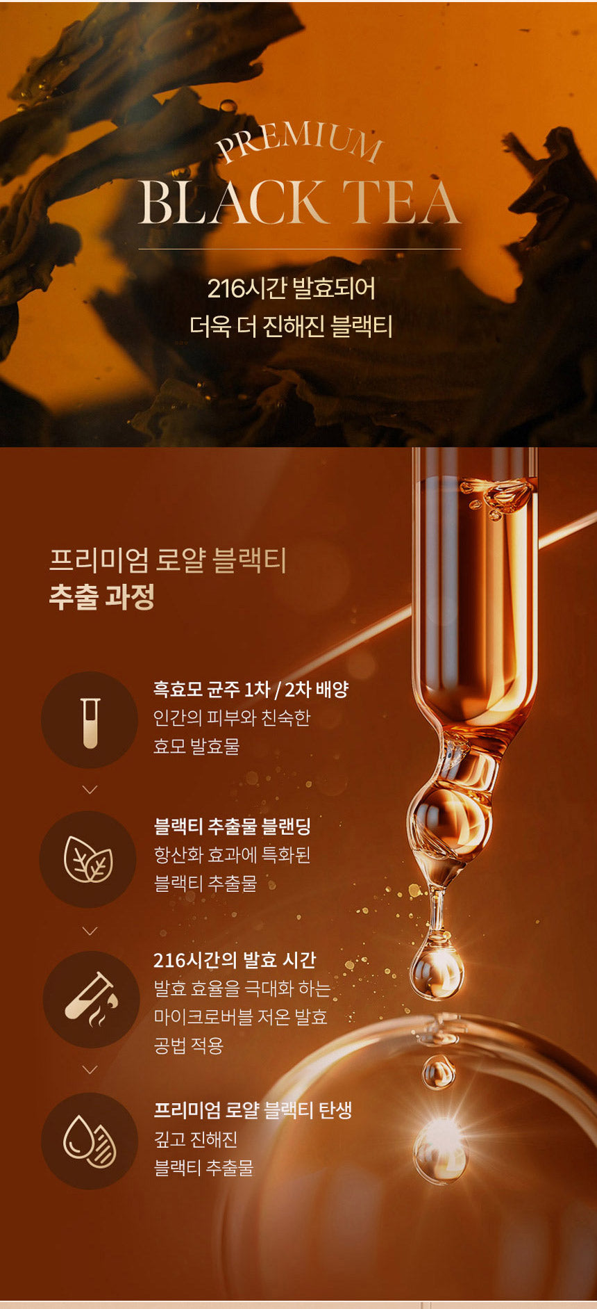 Our unique black tea blend undergoes a dual-stage fermentation process, starting with a black yeast strain culture, followed by the blending of black tea extract. This 216-hour fermentation, utilizing a microbubble low-temperature method, ensures maximum efficiency, resulting in the creation of our premium royal black tea. This process not only enhances the depth and richness of the tea but also imbues it with potent skin-rejuvenating properties.