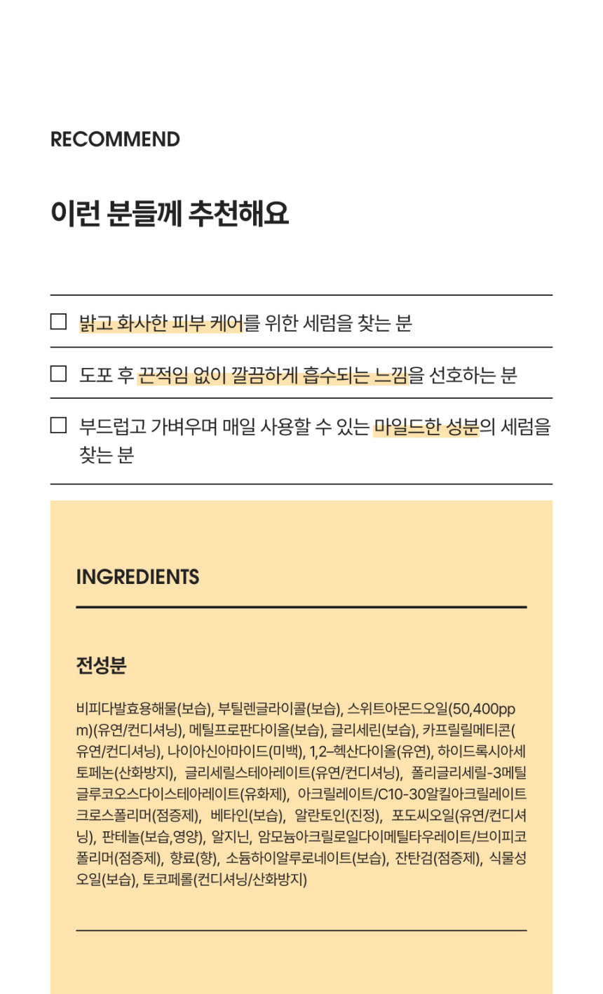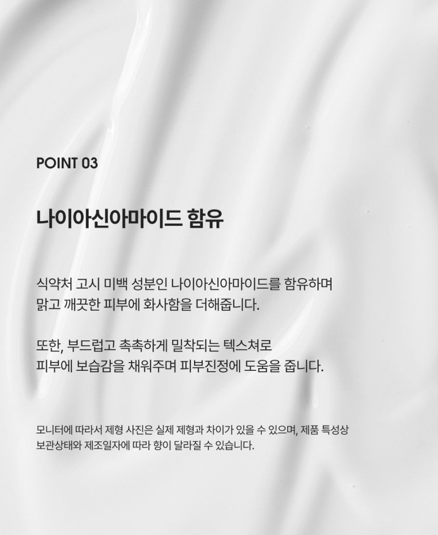 Formulated with niacinamide, a whitening agent approved by the Korean Ministry of Food and Drug Safety, our serum promotes a clear, radiant complexion while also offering moisturizing and soothing benefits.