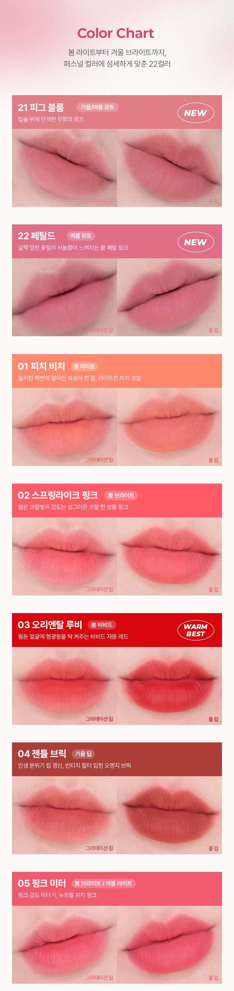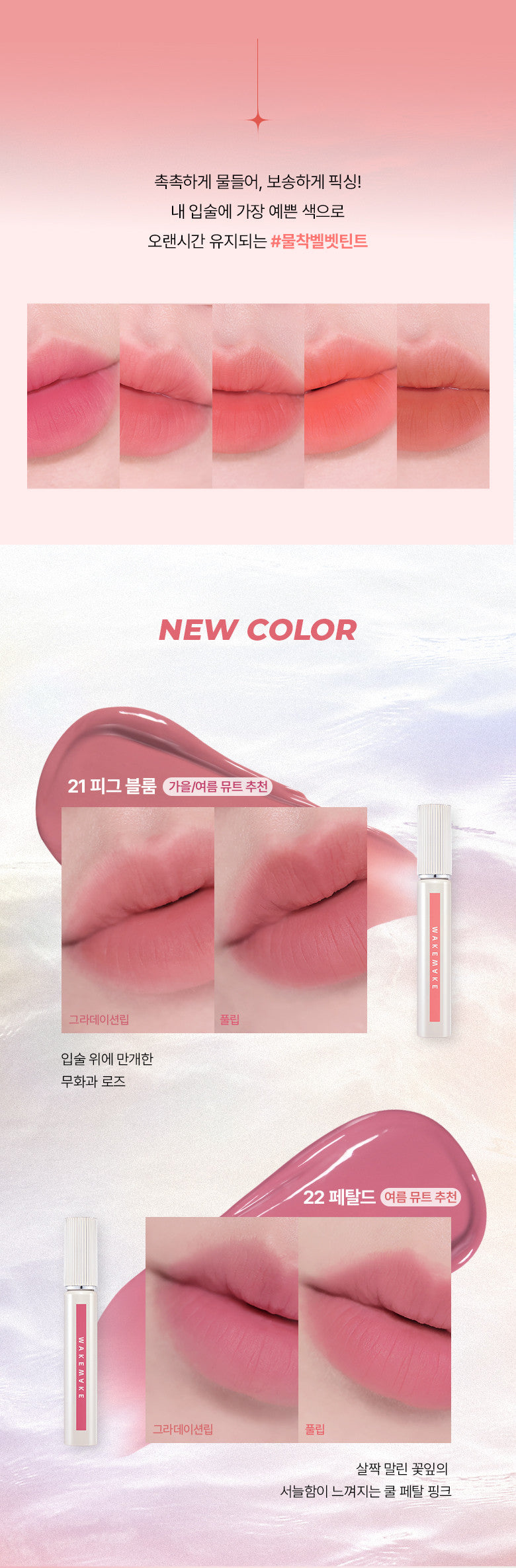 Experience the revolutionary WAKEMAKE Water Blurring Fixing Tint, now with enhanced delicate and smoother fixing power. This upgraded velvet tint combines the freshness of water with a velvet finish, ensuring a perfect, moist look without lifting or clumping.