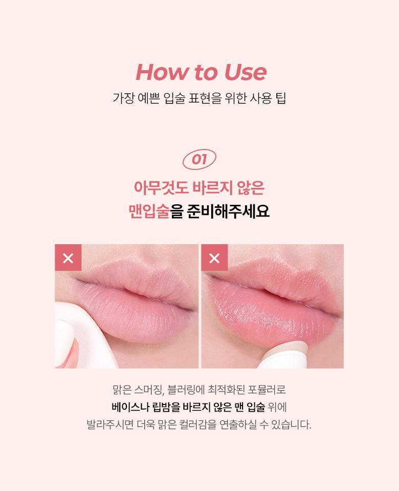 Start with clean, bare lips free from any products. For a clearer color and optimal blurring effect, apply the tint directly on your bare lips without using a base or lip balm. -