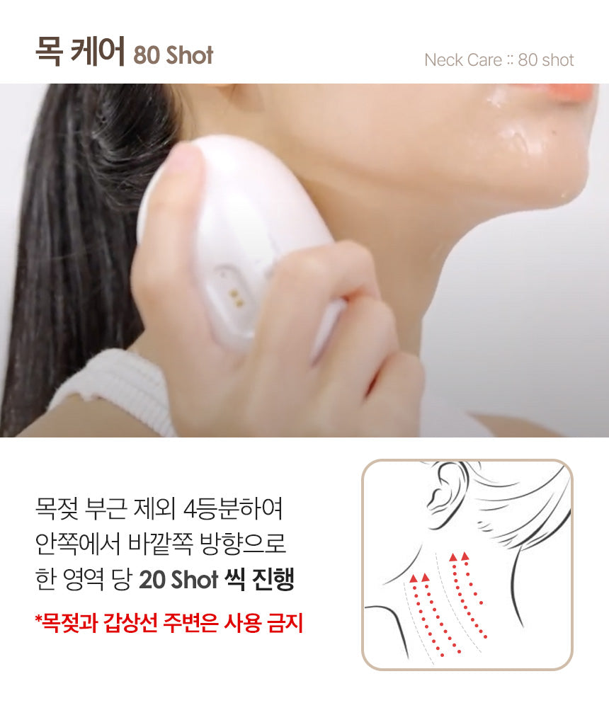 - Divide into four sections, excluding the area around the uvula, and perform 20 shots per area from the inside to the outside.