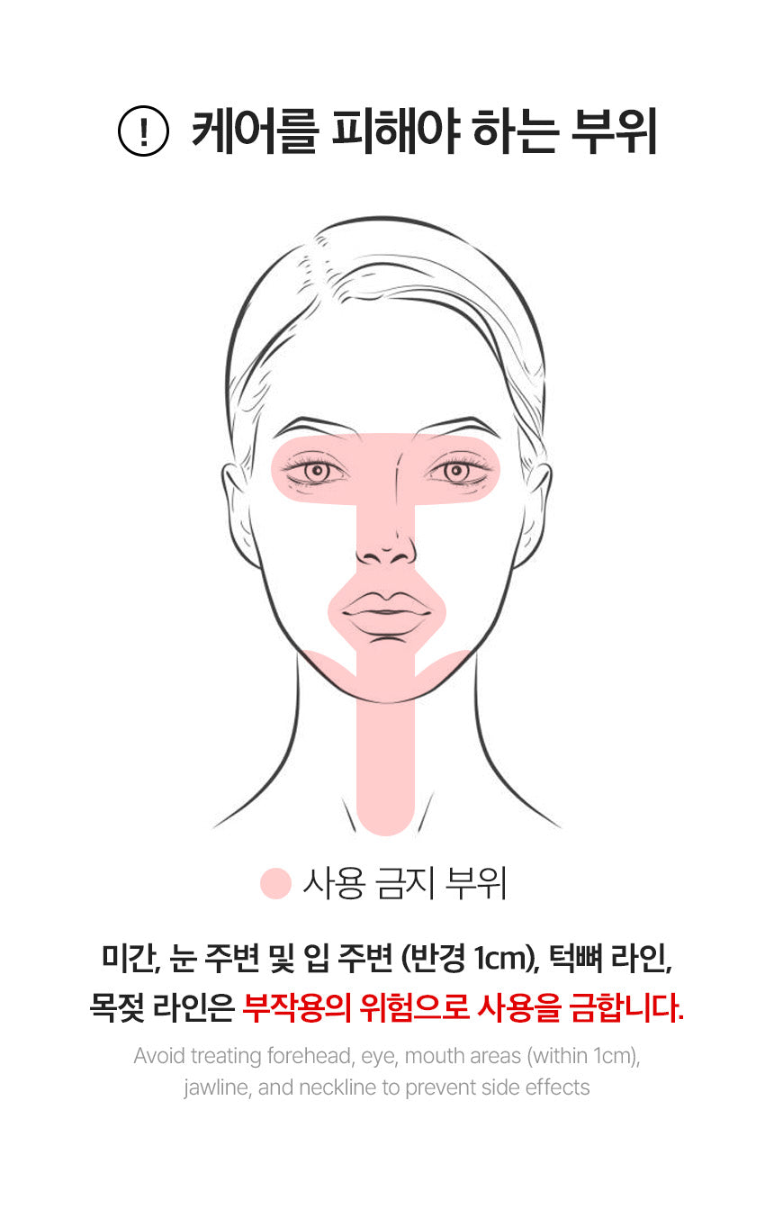 - Do not use between the eyebrows, around the eyes and mouth (radius 1cm), jawline, or uvula line due to the risk of side effects.